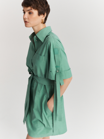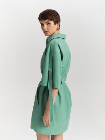 Стильное платье-рубашка пепельно-зелёного оттенка выполнено из 100% хлопка с легким краш-эффектом. Натуральный материал обладает отличной терморегуляцией и обеспечивает комфорт в течение всего дня. Модель длиной чуть выше колена дополнена отложным воротником, застёжкой на планку с потайными пуговицами и накладными карманами. Аккуратный рукав со спущенным плечом декорирован длинными патами и фирменным патчем с вышивкой. Линию талии подчеркивает пояс – лента из основного материала. Платье станет основой современного городского образа, который можно дополнить кожаными сабо или мюлями.