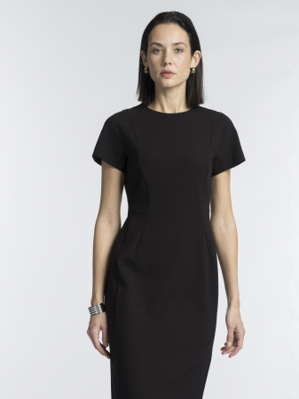 Выбрали для платья лаконичный крой - длину ниже колена, круглый вырез и потайную молнию сзади. Модель мягко облегает тело, а небольшой разрез сзади обеспечивает удобство при ходьбе.