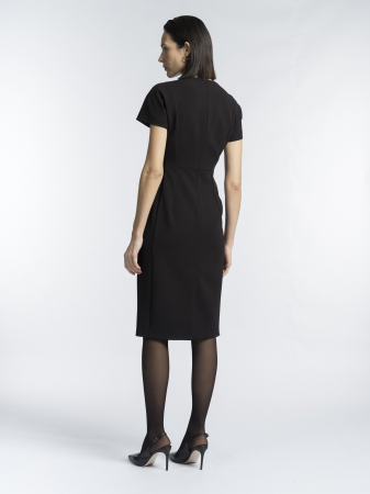 Сшили платье из эластичной костюмной ткани с вискозой. Она отлично держит форму, позволяет коже дышать и не теряет вид со временем. Классический черный цвет — идеальная основа для любого образа, от строгого офисного до вечернего.