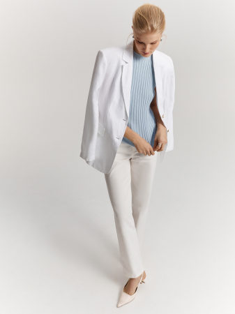 Нежно-голубой топ в крупный фактурный рубчик выполнен из премиальной пряжи на основе 100% хлопка. Благодаря эластичной вязке изделие мягко повторяет контуры тела, обеспечивая максимальный комфорт. Наличие проймы «американка» делает его более женственным и романтичным. Топ с круглой горловиной станет отличной базой в гардеробе. В сочетании с юбкой-миди и легкими брюками карго составит стильный и удобный образ.