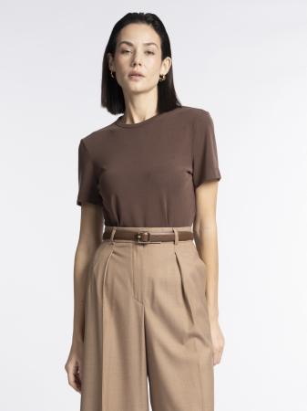 Облегающая футболка с круглым вырезом и отделкой горловины бейкой - актуальный участник базового гардероба в благородном коричневом оттенке.