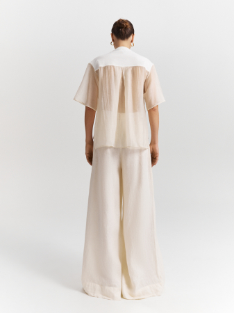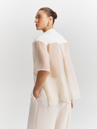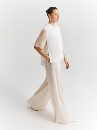 Универсальная футболка прямого кроя с акцентными рукавами выполнена из мягкого, приятного на ощупь материала на основе вискозы. Волокна нейлона в составе ткани позволяют изделию отлично садится по фигуре и надолго сохранять первозданный внешний вид. Рукава и спинка изделия выполнены из полупрозрачной ткани, что придает футболке еще большую легкость. Круглая горловина обработана плотной резинкой и держит форму. Рекомендуем сочетать с льняными брюками или юбкой из этой же коллекции.