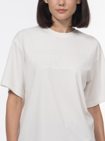 Футболка с лого-вышивкой For you (рус. Для тебя) - это продолжение манифеста, провозглашенного в рамках бренд-платформы ELIS "Выбираю себя". Выражая любовь и уважение к себе каждый день, женщина ELIS выбирает понятные четкие образы, дающие уверенность. Белый, цвет из монохромной палитры, отличная база для вышивки с характером, выполненной на оборудовании TAJIMA на собственном производстве полного цикла. Выполнили модель в актуальном полуприлегающем силуэте, с круглым вырезом и втачным рукавом со спущенным плечом из тактильно приятного вискозного трикотажа. Футболка с пайетками в стилистике mermaid-core будет прекрасным дополнением к джинсам и брюкам из коллекции, а также под пиджак.