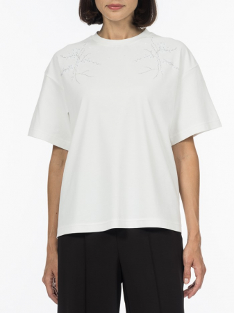 Футболка выполнена в стиле "романтический кэжуал". Флоральная вышивка, являющаяся лейтмотивом капсульной коллекции, и свободный крой добавляют образу женственности и утонченности. Лаконичный дизайн и хлопковый трикотаж делают блузу универсальной. Футболка выполнена из высококачественного хлопкового трикотажа, прошедшего мерсеризацию. Это процесс обработки хлопка, который делает его более прочным, гладким и блестящим. Ткань становится устойчивой к износу, меньше мнется и лучше сохраняет цвет. Мерсеризованный хлопок приятен на ощупь, обеспечивает комфорт и воздухопроницаемость. Базовый белый - универсальный цвет, который легко сочетается с другими оттенками, что делает футболку незаменимым элементом гардероба. Симметричная вышивка на груди, выполненная на собственном производстве с помощью японского оборудования Tajima, добавляет элемент дизайна, делая блузу более интересной и стильной, особенно потому, что рисунок вышивки повторяет цветочные мотивы основного принта капсульной коллекции. Круглый вырез создает аккуратный и сбалансированный силуэт, подчеркивая зону декольте и не перегружая модель с достаточно активным декором.