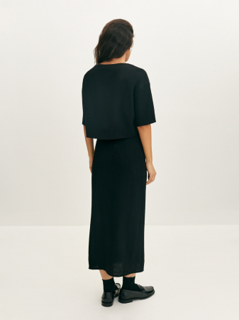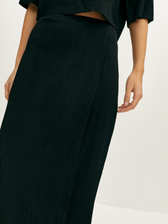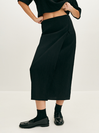 Лаконичная юбка-миди базового черного цвета из фактурной жатой ткани. Модель прямого силуэта, полуприлегающего кроя. Удобная посадка и деликатный дизайн подойдут любому типу фигуры и визуально вытягивают силуэт. Акцентной деталью является имитация запаха, придающего изделию динамику. Натуральная вискоза комфортна и позволяет коже дышать, ткань идеально подойдет на теплую весеннюю погоду. Составит монохромный тотал-лук совместно с воздушной блузой из того же материала.