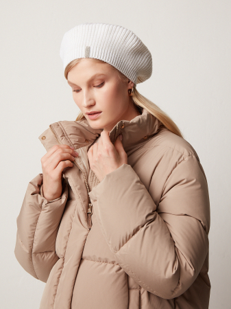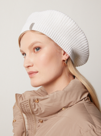 Берет вязаный с шерстью мериноса с декором на резинке. Аксессуар из данного материала легкий и теплый.