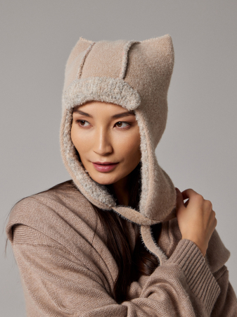 Ушанка двойная с шерстью мериноса, из комбинированной пряжи с завязками, с ушками, без флиса.