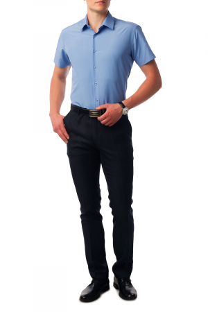 Рубашка классическая, однотонная тёмно-синего цвета. Воротник классический, 1 карман,короткий рукав. Силуэт классический,под заправку. Стиль деловой. Носить можно с джинсами и с брюками в контраст к тону основной ткани.