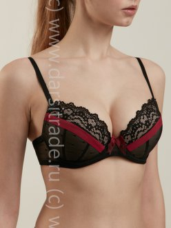 Бюстгальтер «пуш-ап» с формованной чашкой, на каркасах. Бретели, отстегивающиеся на спинке. Выполнен из кружева и сетчатого полотна в мелкий горошек. Ленты из эластичной органзы и бантики подчеркивают нарядный образ.