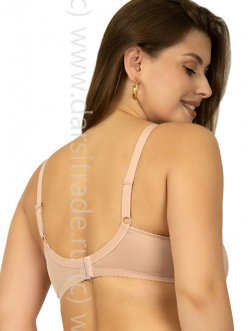 Бюстгальтер полудублированный на стане, на каркасах. Нижние детали чашек на дубляже с хлопком. Верхние детали чашек из эластичного кружева продублированные эластичной сеткой. Верхний край усилен эластичной тесьмой. Передняя и боковые детали стана укреплены монокапроном, в боковых швах упругие пластины. Бретели «anti-slip». Материал: сутажное кружево, эластичная сетка.
