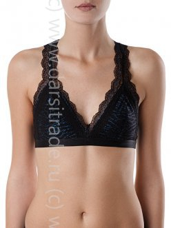 Бюстье женское из кружевного полотна с двойными мягкими чашками. Бретели переходят на спинку образуя треугольную вставку. Низ изделия обработан притачной эластичной тесьмой.