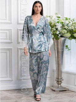 Комплект Mia-Amore выполнен из принтованного смесового шёлка и состоит из жакета и широких брюк-палаццо. Жакет по талии имеет застежку на пуговицы, спереди в рельефах небольшие разрезы, на спинке по талии декоративные буфы с резинкой, которые приталивают