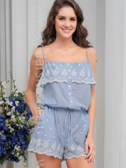 Короткий комбидресс Mia-Amore на тонких бретелях, с застежкой на пуговицы, из натурального хлопка в голубую полоску. Спереди, по линии декольте, накладной декоративный волан. В пояс вставлен шнурок с металлическими наконечниками, в боковых швах карманы. Волан и низ комбидресса декорированы вышивкой молочного цвета.