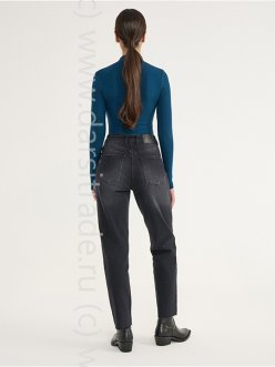 Черные джинсы mom с эффектом потертости и необработанным краем. Высокая посадка, подчеркивающая талию, умеренно свободный силуэт mom. Застежка на пуговицу и молнию, скрытую планкой, шлевки для ремня. Модель с пятью карманами, мягкий eco-friendly деним с эффектом потертости.