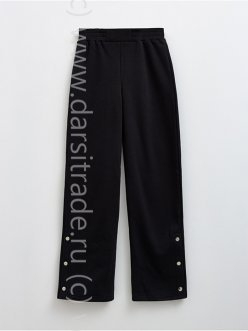 Брюки с высокой посадкой и разрезами по низу на кнопках. Прямой крой, притачной пояс с эластичной тесьмой внутри, без карманов. По низу в боковых швах выполнены разрезы с функциональными кнопками. Выполнена из плотного, приятного к телу футера на флисе
