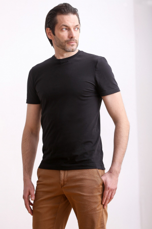 Футболка с коротким рукавом и круглым вырезом черного цвета. Комфортна, хорошо садится на фигуру, не вытягивается не садится. Базовая коллекция, универсальная модель.