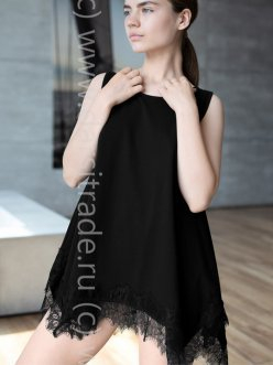 Женская блуза-туника без рукавов, летящего А-образного силуэта. Выполнена из хлопкового трикотажного полотна, снизу оторочена ажурным кружевом. Идеальный предмет Вашего базового гардероба! Носим с узкими брючками, лосинами, с обувью на каблуке и без, с украшениями и без них.