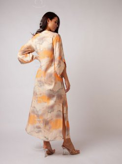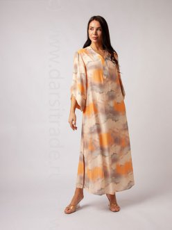 Платье макси, свободного силуета, боковые разрезы добавляют образу лёгкость, а V-образный вырез подчёркивает женственность. Втачной длинный рукав в форме "тюльпанчика". Горловина и низ рукава декорированы планкой. Принт - пастельный адрес придает восточный колорит и нежность всему изделию.