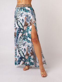 Расклешенная длинная юбка с двумя глубокими разрезами в передней части. Пояс широкий, с частичной резинкой.