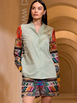 Комплект Mia-Amore состоит из рубашки с воротником-стойкой и шорт, выполнен из хлопка со льном. Полочка рубашки выполнена из однотонной ткани, а спинка и рукава рубашки и шорты – из принтованной. Шорты с широким эластичным поясом. По бокам шорт расположены карманы.