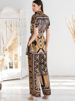 Комплект рубашка и брюки Mia-Amore выполнен из тканой вискозы с купонным принтом. Удлинённая рубашка на пуговицах с короткими цельнокроенными рукавами, рубашечным воротником и разрезами по бокам. Низ рукавов рубашки оформлен узкой манжетой, по талии регулируется съемным поясом. Брюки свободного силуэта с поясом на резинке и боковыми карманами.