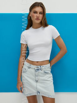 Женская укороченная футболка из трикотажа кашкорсе с коротким рукавом и круглым вырезом. Материал произведенный из мягкого хлопка c добавлением эластана, обладает высокой воздухопроницаемостью, превосходно адаптируется к любой фигуре, хорошо сохраняет форму и цвет, комфортно облегает, подходит для чувствительной кожи. Футболка стильно смотрится благодаря оригинальной вязке «английская резинка» и гармонично дополнит повседневные и деловые образы.
