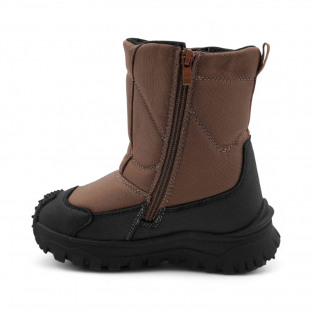 Материал: Верх обуви выполнен из непромокаемого текстиля, что обеспечивает надежную защиту от снега и влаги. Вставки из эко-кожи дополнительно защищают мысок и пятку сапожек от механических повреждений. Подкладка и стелька из искусственного меха, которая обладает отличными теплоизоляционными свойствами.