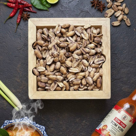 Состав: арахис баланшированый (обжаренный, рафинированное дезодорированное (выдержанное) масло, соль, специи, крахмал кукурузный, рисовая мука, сахар, декстроза, ароматизатор (Том Ям), соль, глютамат натрия (Е621), усилитель вкуса (Е635), кориандр молотый, лимонная кислота (Е330), краситель (Е102), экстракт глютена пшеницы, сахарозаменитель сорбит (Е420), стабилизатор (Е471), меланж яичный, разрыхлитель (Е500), ароматизатор пищевой, чеснок, лук, перец, паприка, орех мускатный, антислеживающий агент (Е551). Продукт может содержать следы кунжута, горчицы, сои, молока, сельдерея.