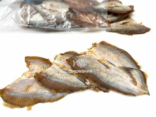 Сушеная рыбка царский полосатик в отличие от желтого полосатика больше в размерах. в распластанном виде достигает 17-20 см.