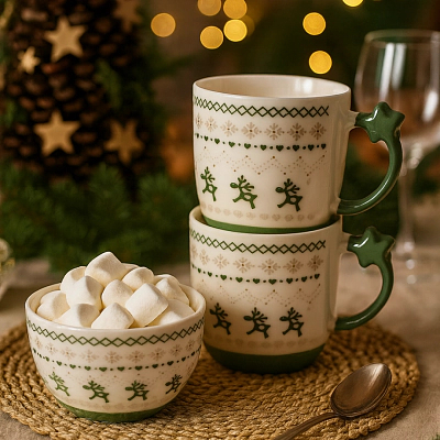 Уютная зимняя деталь, которая создаёт настроение с первого взгляда. Глубокий зелёный оттенок, праздничный декор и удобная форма делают её идеальной для горячего шоколада, кофе или ароматного чая в холодные дни. Отличный выбор для подарка и для тёплых домашних вечеров.
