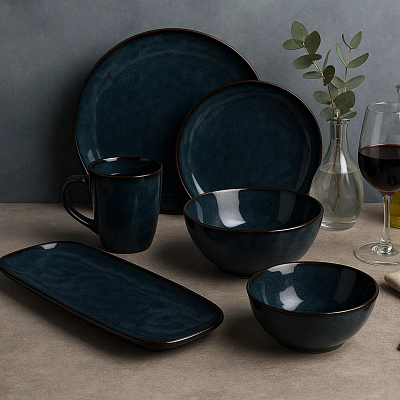 Это воплощение стиля и прочности. Глубокий матовый оттенок ночного камня подчеркивает современный характер сервировки, а натуральная текстура керамики придает каждой детали изысканность и долговечность.