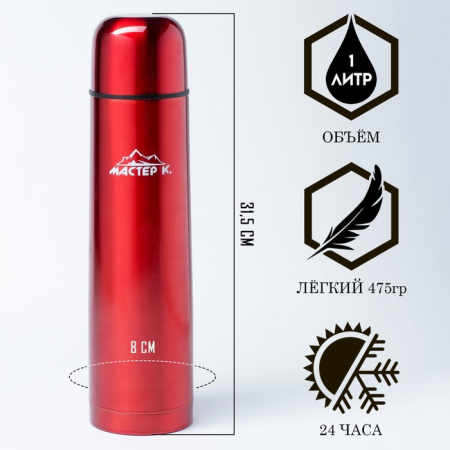 Термос 1 л "Мастер К" изготовлен из высококачественной нержавеющей стали, имеет двойные стенки, обеспечивающих вакуумную термоизоляцию. Легкий и прочный термос "Мастер К" сохранит ваши напитки горячими или холодными надолго. Это идеальный выбор для тех, кто хочет наслаждаться горячими напитками во время отдыха на природе или в поездках, напиток останется теплым и свежим, готовым к наслаждению в любой момент. Термосы этой серии пользуются большой популярностью у активных и динамичных пользователей, а также у любителей охоты и рыбалки, так как они, сохраняют прочность и термоустойчивость, легки и компактны.