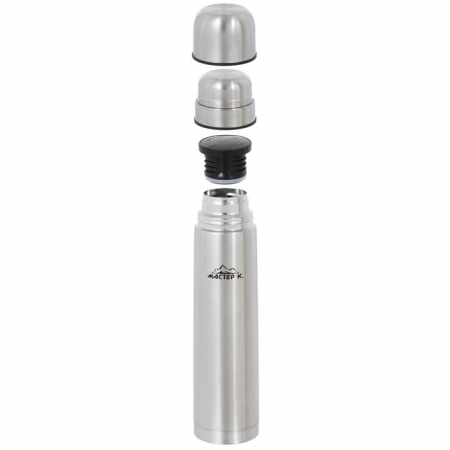 Серебристый термос с двумя кружками – вакуумная ёмкость из нержавеющей стали объёмом 1 литр. Он сохраняет тепло до 24 часов благодаря металлической колбе.