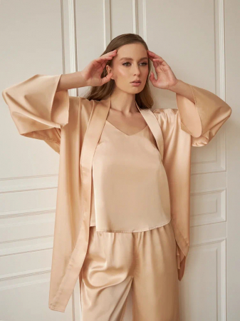 Шелковая пижама включает в себя топ, брюки и халат. Она выполнена из мягкого и нежного атласного материала, который приятен на ощупь и комфортен для ношения. Топ имеет регулируемые бретели и V-образный вырез. Брюки с эластичным поясом, обеспечат комфортную посадку и свободу движений. Халат с длинными рукавами, застегивающийся на пояс, добавит завершенности комплекту.