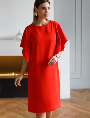 Платье из плотного струящегося крепа прямого кроя с «парящими» рукавами. Фасон платья сбалансирует любой тип фигуры: прямой свободный крой, универсальная длина подола – чуть ниже колена, широкая пройма и акцентные рукава. Классический О-образный вырез фиксируется сзади изящной золотой пуговицей. Материал почти не мнется и комфортен в носке.