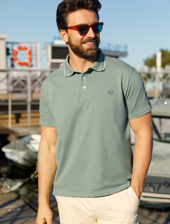 Футболка-поло выполнена из фактурного трикотажа. Модель с прямого кроя с небольшими разрезами по бокам дополнена вязаным воротником с контрастными пуговицами в тон тонкой полосы и вышитым логотипом бренда. Премиальный хлопковый трикотаж гарантирует комфорт и износостойкость. На рукаве брендированная нашивка из эко-кожи.