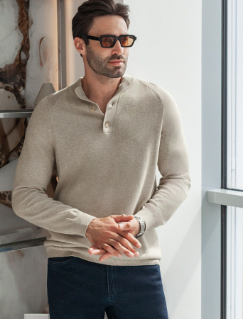Светло-бежевый джемпер меланж с воротом, застегивающимся на черепаховые пуговицы, связали из мягкого хлопка с добавлением акрила; состав, который отлично согревает, не колется и при этом не перегревает тело, поэтому вещь получилась максимально комфортной для переменчивой погоды. Повседневный образ поддержат черные брюки, синие джинсы и броги.