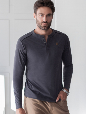 Лонгслив темно-серого цвета с эффектом меланж с длинным рукавом выполнен из премиального хлопка с эластаном, Мягкий материал обеспечивает приятные тактильные ощущения,натуральный состав ткани позволяет коже дышат, удобен в повседневной длительной носке. Благодаря эластичному материалу лонгслив тянется и создает комфортный полуприлегающий силуэт. Подходит для маленьких и больших размеров, не сковывает движения и сохраняет форму после стирки. Облегающий лонг выгодно выделяет линии тела, при этом в нем ощущается свобода движений. Круглый ворот на металлических пуговицах создает стильный образ, который легко впишется в базовый гардероб. Тонкий джемпер дополнен нашивкой из эко кожи с логотипом бренда.