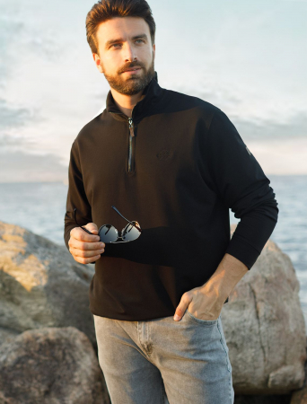 Уютный и стильный свитшот черного цвета с воротом-стойкой на молнии - идеальный выбор для повседневного образа. Выполнен из премиального футера двухнитки с эластаном, Изнаночная сторона невероятно мягкая, что делает материал особенно приятным к телу. Благодаря эластичной структуре ткань хорошо тянется, сохраняет форму после длительной носки и обеспечивает свободу движений даже в самых активных буднях, а натуральный состав обеспечивает отличную воздухопррницаемость, позволяя коже дышать и не перегреваться.