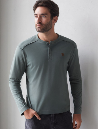 Лонгслив темно-оливкового цвета с длинным рукавом выполнен из премиального хлопка с эластаном, Мягкий материал обеспечивает приятные тактильные ощущения, натуральный состав ткани позволяет коже дышать, удобен в повседневной длительной носке. Благодаря эластичному материалу лонгслив тянется и создает комфортный полуприлегающий силуэт. Подходит для маленьких и больших размеров, не сковывает движения и сохраняет форму после стирки. Облегающий лонг выгодно выделяет линии тела, при этом в нем ощущается свобода движений. Круглый ворот на металлических пуговицах создает стильный образ, который легко впишется в базовый гардероб. Тонкий джемпер дополнен нашивкой из эко кожи с логотипом бренда.