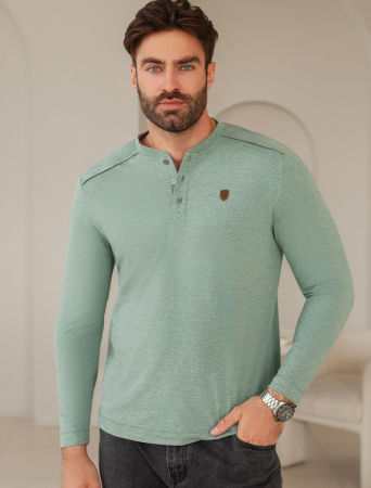 Лонгслив светло-оливкового цвета с эффектом меланж с длинным рукавом выполнен из премиального хлопка с эластаном, Мягкий материал обеспечивает приятные тактильные ощущения, натуральный состав ткани позволяет коже дышать, удобен в повседневной длительной носке. Благодаря эластичному материалу лонгслив тянется и создает комфортный полуприлегающий силуэт. Подходит для маленьких и больших размеров, не сковывает движения и сохраняет форму после стирки. Облегающий лонг выгодно выделяет линии тела, при этом в нем ощущается свобода движений. Круглый ворот на металлических пуговицах создает стильный образ, который легко впишется в базовый гардероб. Тонкий джемпер дополнен нашивкой из эко кожи с логотипом бренда.