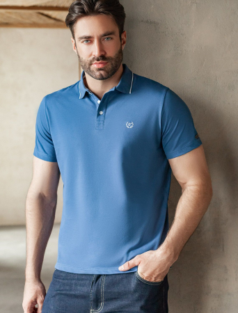 Футболка-поло выполнена из фактурного трикотажа. Модель с прямого кроя с небольшими разрезами по бокам дополнена вязаным воротником с контрастными пуговицами в тон тонкой полосы и вышитым логотипом бренда. Премиальный хлопковый трикотаж гарантирует комфорт и износостойкость. На рукаве брендированная нашивка из эко-кожи.