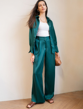 Брюки-палаццо выполнены из полуматового плотного сатина, который плавно струится по ногам, напоминая натуральный шелк. Визуально удлиняют ноги и акцентируют внимание на талии. Совет стилиста: сочетайте брюки в костюме вместе с топом D23.057 и блузкой D29.796 чтобы создать роскошный праздничный образ, или используйте как яркий акцент в базовом гардеробе, с вязаным верхом, полупрозрачной блузкой и топами из хлопка.