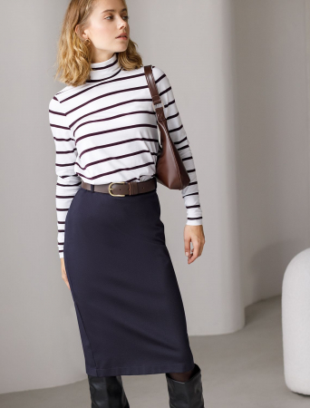 Юбка-карандаш выполнена из плотного джерси. Высокая посадка на талии. Сзади застежка на потайную молнию и шлица. Эластичный джерси почти не мнется, хорошо сохраняет форму и не оставляет заломов. Классический вариант для офиса или делового мероприятия.