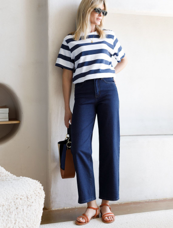 Укороченные прямые джинсы классического синего цвета. Выполнены из хлопка с добавлением эластана. Отлично держат форму почти не мнутся, не деформируется даже после множества стирок. Модель подходит абсолютно любому типу фигуры и вписывается в гардероб с любым верхом и обувью.