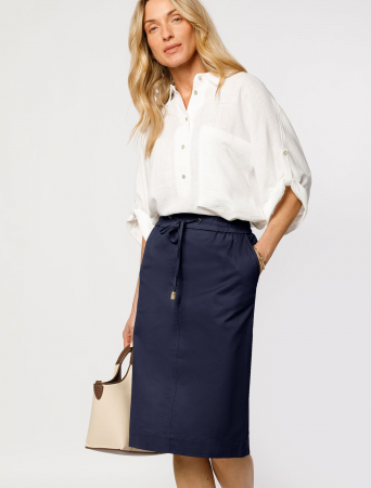 Юбка прямого силуэта выполнена из тонкого хлопкового твила. Модель дополнена боковыми карманами и эластичным поясом с дополнительным регулируемым шнуром. Благодаря наличию эластана в составе, изделие сохранит свой безупречный внешний вид в течении долгого времени. Изделие впишется в любой гардероб и подойдет даже для офисного дресс-кода.