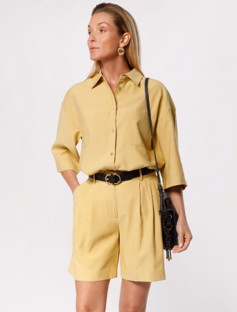Шорты выполнены из плотного лиоцела. Добавление синтетических волокон в составе изделия предотвращает сминаемость. Эластичный пояс на резинке фиксирует изделие не сковывая движений. Есть дополнительные шлевки для ремня. Свободная модель дополнена боковыми карманами и металлическим логотипом бренда. Для создания завершенного образа сочетайте в костюме с топом D23.058, блузкой D28.054, D29.238, D29.239 и D29.240