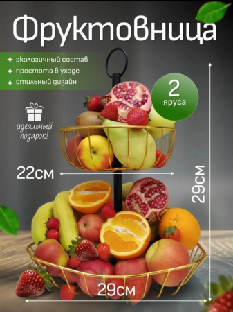 Корзина для фруктов с двумя ярусами выполнена из прочного металла и обладает оригинальным геометрическим дизайном. Каждый ярус представляет собой изящную чашу в виде металлической сетки (нижняя корзина–29*29 см, верхняя корзина–диаметр 22 см). Стильный набор прекрасно впишется в любую кухню и станет актуальным украшением стола. Красивое блюдо удобно использовать для подачи фруктов, конфет, пирожных и даже орешков. Настольная этажерка придаст праздничный вид любому мероприятию.