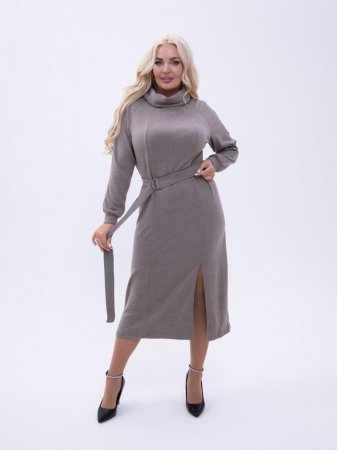 Трикотажное платье с воротником "хомут" полуприлегающего силуэта,выполнено из трикотажного полотна ангора.Рукав -реглан длинный на манжете .Спереди и сзади вертикальные рельефы выходят из горловины.В одном из рельефов переда оформлен разрез.Платье без застежки и подкладки.Пояс в комплекте.Это платье простое и комфортное.Вертикальные линии вытягивают и стройнят фигуру.Платье без карманов.Стирка при t не выше 30 градусов.Не отжимать.Горизонтальная сушка.Параметры модели на фото ОГ-100,ОТ-80,ОБ-106,рост 178 см.Размер на модели 50.