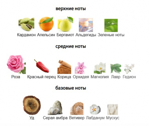 Верхние ноты: Апельсин, Бергамот, Кардамон, Зеленые ноты и Альдегиды; средние ноты: Роза, Красный перец, Корица, Лавр, Магнолия, Орхидея и Гедион; базовые ноты: Уд, Серая амбра, Ветивер, Мускус и Лабданум.